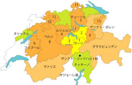 都市邦 4ルツェルン、5チューリヒ、8ベルン、9フリブール、
