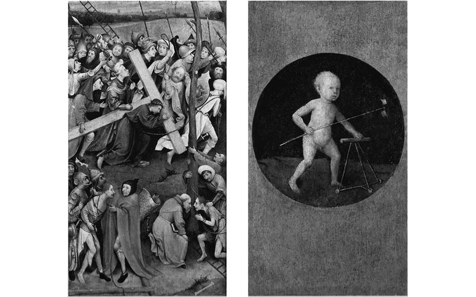十字架を担うキリストの周りには異様な雰囲気の人々。先導する兵士の盾にはカエルがへばりついている。