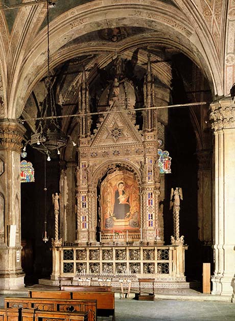 1352年オルカーニャは石工・木工師組合に入会している。アンドレア・ピサーノの弟子だったとも伝えられ、経験があったのかもしれない。この頃からオルサンミケーレ聖堂の「聖壇(タベルナーコロ)」に着手し、背面の記銘から1359年にはほぼ完成していたことがわかる。西側正面にベルナルド・ダッディの「聖母子」,背面にオルカーニャの「聖母の埋葬と被昇天」、下層にはマリア伝や諸徳像を配している。