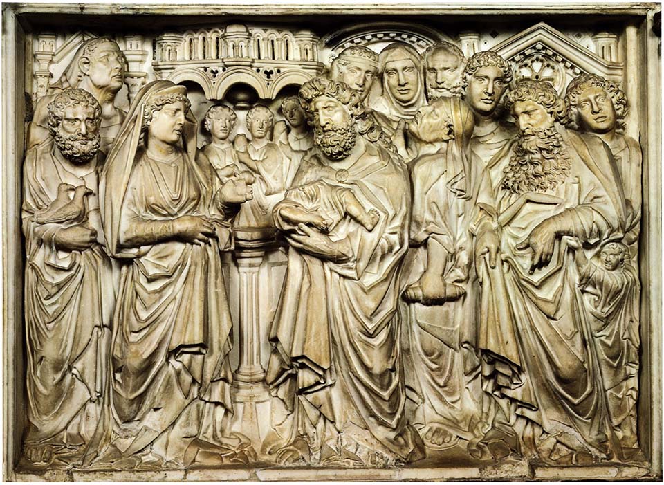 ニコラ・ピサーノ Nicola Pisano 1200年代後半 キリストの神殿奉献(説教壇部分) 大理石 85×113cm イタリア, ピサ洗礼堂 左 グイド・ダ・コモ Guido da Como説教壇 1250年 大理石イタリア ピストイア サン・バルトロメオ・イン・パンターノ聖堂世界美術大全集10 ゴシック2 モノクロ