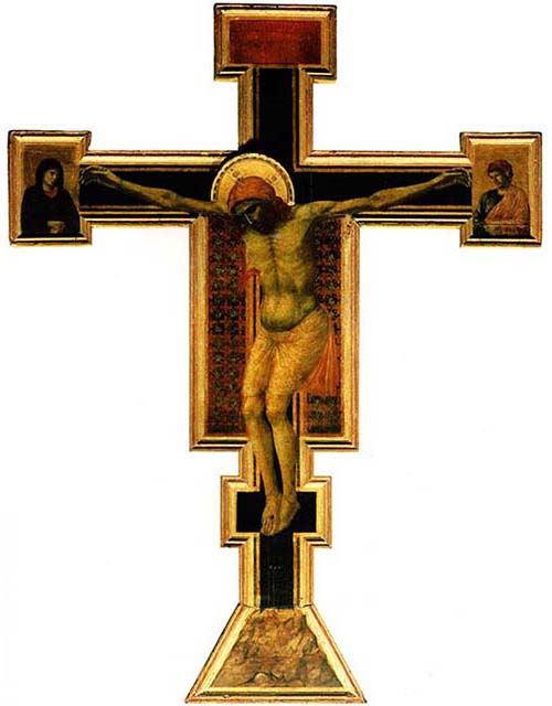![]() | サンタ・マリア・ノヴェッラ聖堂の巨大な 「十字架上のキリスト」 トスカーナ派の十字架形磔刑図に見られるビザンティン的パターン化表現を一掃、重々しい肉体的実在感を具えた「死せるキリスト」のイメージを示した作品。 アッシジの壁画との類似性も見られる。 世界美術大全集10 ゴシック2 1200年代後半 ジョット Giotto 十字架上のキリスト 1295年頃 板 テンペラ 578×406cm フィレンツェ サンタ・マリア・ノヴェッラ聖堂 世界美術大全集10 ゴシック2 |