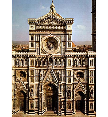アルノルフォは1296年以降(1302年)死去するまで大聖堂の制作企画にあたっていた。西正面はマリア伝サイクルを構成する彫像で飾られ、中央入口上のリュネットにこの「聖母子」は置かれていた。その両側にはフィレンツェの守護聖人「聖女レパラータ」と「聖ゼノピウス」、左側のリュネットに「降誕の聖母」右側のリュネットに「聖母の死」が置かれていた。地上の豊かな量感と天上の荘厳さを備え正面を向いた聖母子像は、ガラスで象眼された目によってその聖性を高めている。