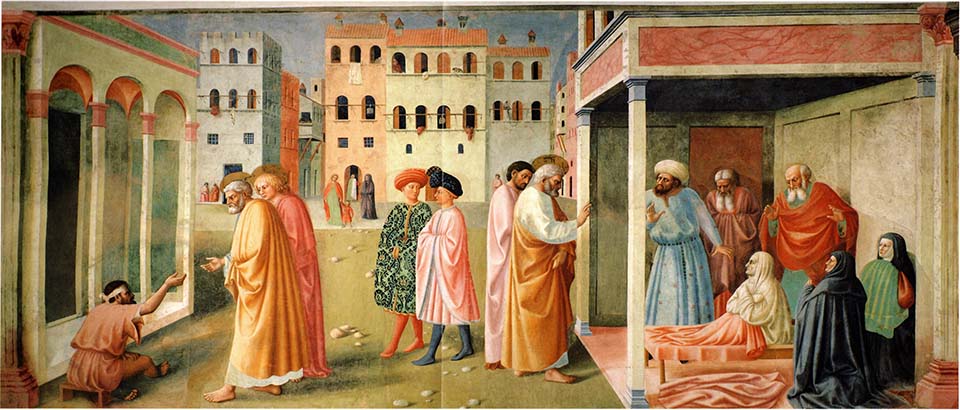 フィレンツェの家並みや広場を背景に聖ペテロ伝からの2挿話が描かれている。右は生前に数々の良い働きや施しを行っていたタビタという婦人が病で亡くなり、亡骸が室内に安置されているところに聖ペテロが訪れ、「タビタよ、起きなさい」と祈るとタビタが目を開け、ペテロを見て起き直ったところ。