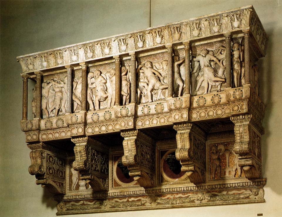 ドナテッロは正面に二枚の大理石材に彫られた乱舞するプットを置き、その前に小円柱を挿入することで架空の舞台を作っている。天上の熱狂的歓喜を表している。
