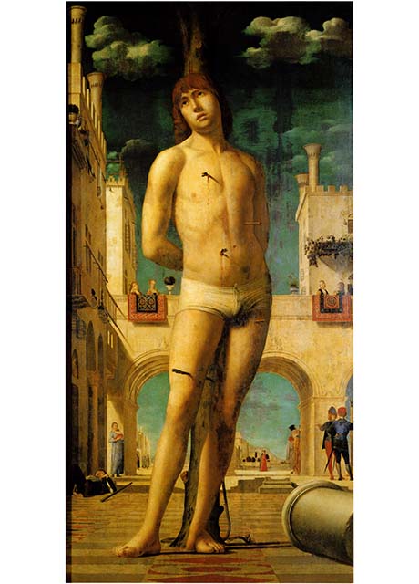 ヴェネツィアの当世風の建物に囲まれた幾何学模様の床の空間が透視図法で描かれている。聖ロクス、聖セバスティアヌスはペストや疫病の守護聖人として崇拝されていた。古代彫刻のような肉体の若い聖人に悲壮感はみられず、身体に刺さる矢は持物(アトリビュート)として描かれている。