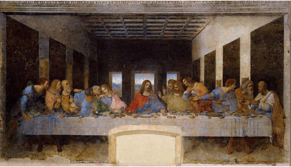 レオナルドが描いたのは、キリストから「このなかに裏切り者がいる」という言葉が発せられた瞬間の使徒たちの様子。使徒たちは3人ずつのグループにに分けられ、それぞれが身振りで驚きや動揺を表している。やや色黒に描かれたユダ(キリストの左3人目)は袋を手に上体を引いている。