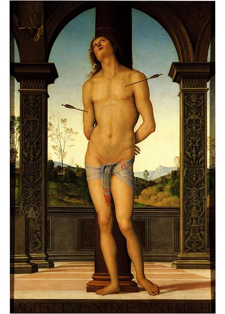 皇帝ディオクレティアヌスの近衛兵だった聖セバスティアヌスは、キリスト教に改宗したため矢を射られた。疫病(ペスト)除けの聖人として信仰を集めていたが、ルネサンス期には男性裸体の理想像を描くための主題として画家たちに好まれた。