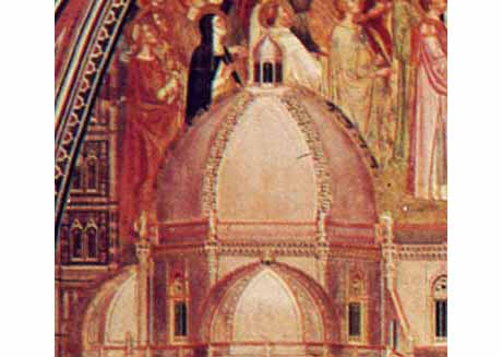 それを見るとドラムの部分がない。1410~13年に造られたドラムは造営局が工事の遅れを指摘されないように新たに付け加えられたもの。高さ9m、壁の厚さ4mのドラムはドームの建設を一段と困難にするものだった。一方そこに設けられた窓によって、1420年にジョヴァンニ・ダ・プラートから出された、ドームの基部に24の窓を設けるべきという案を退けられたのかもしれない。造営局でもドームを架ける具体的な方法が見つからず、時間稼ぎをしていたと思われる。