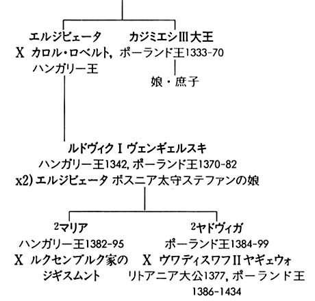 1370年のカジミエシ大王の死去でピアスト家は断絶した。あとを継いだのは大王の姉エルジビェータの子、アンジュー家のハンガリー王ルドヴィク(ポーランド王在位1370〜82)だった。彼は戴冠後、母を総督に任じてハンガリーに戻った。そのため、ポーランド国内の治安が悪化し、大王が獲得していた多くの領土を失った。