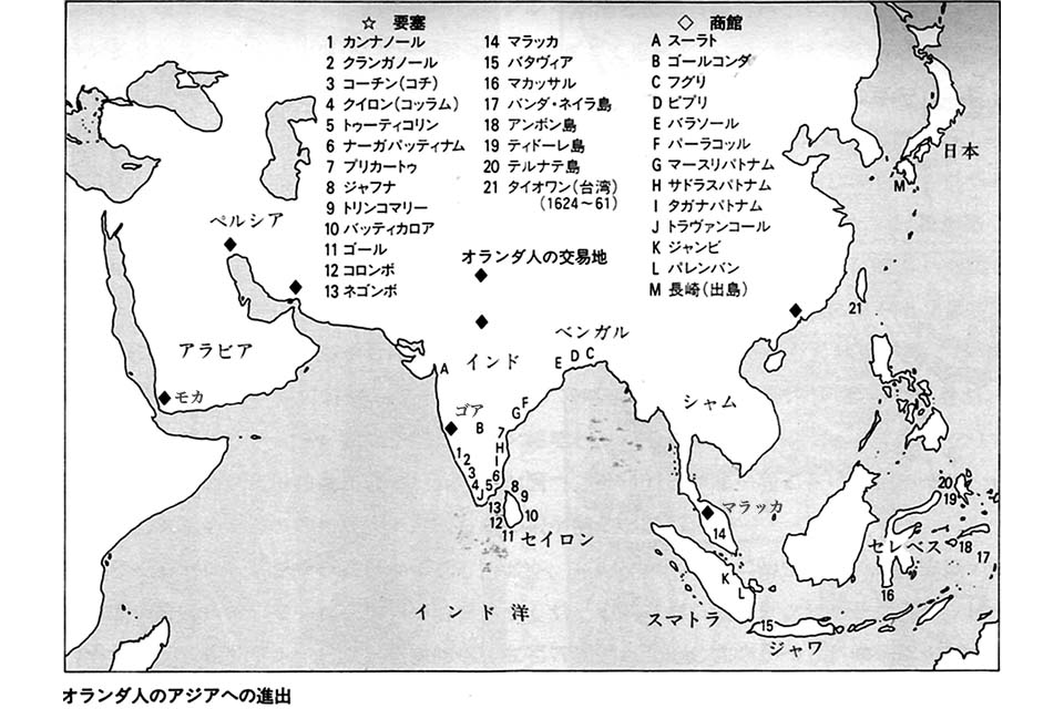 東インド会社は紅海入口のモカからインド洋、東南アジアを経て台湾、日本にいたる広大な海域に約20カ所の要塞と多くの商館をおいて貿易活動を展開した。ほかのヨーロッパ人は1680年代までにインドネシアからほぼ追放されて、胡椒以外の香辛料はオランダ人がほぼ独占するようになった。1730年代まで会社の経営は安定していた。18世紀になると香辛料よりアジア産の綿布、茶、コーヒーなどが求められるようになった。これらは東インド会社の独占とはならず、会社は赤字をだすようになっていった。