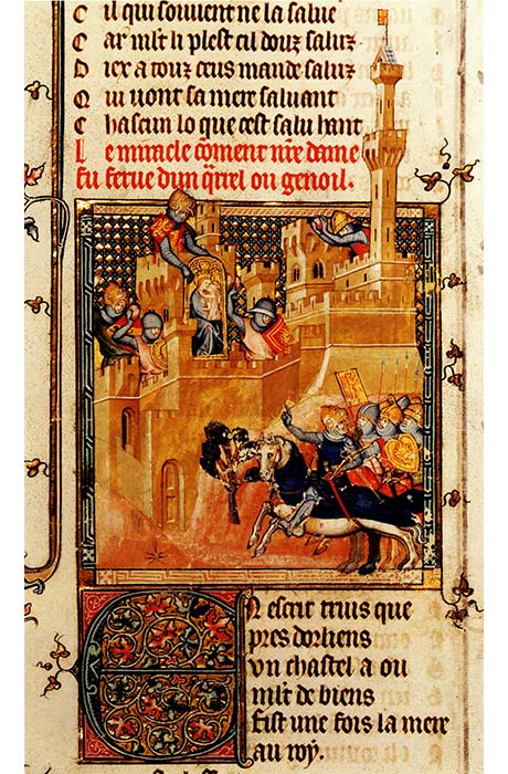 見出しには「聖母像がいかに矢の傷を受けたか」と書かれている。テキストによるとオルレアン近郊のアヴノン(アヴェルノン)という城で美しい聖母像が作られて称賛を集めていた。それが面白くない悪魔は参拝者の金品を奪う目的もあって戦争をしかける。城では入口に聖母像を掲げて防戦、聖母像は膝に大弓で射られた矢を受け城内の人々を守った。