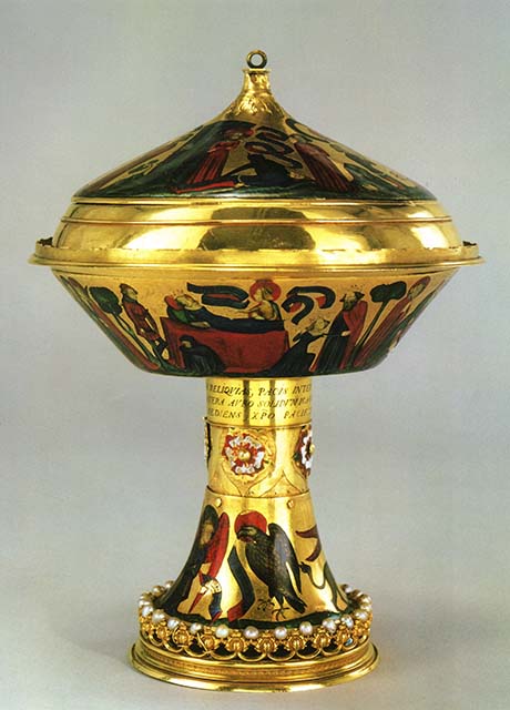 カップ本体内部にはキリスト像が描かれているが、聖堂用の典礼用具ではなく、1391年の目録に腰高大杯と記されていることから、聖女アニエスの祝日などに使われた祝祭用の大杯と考えられている。