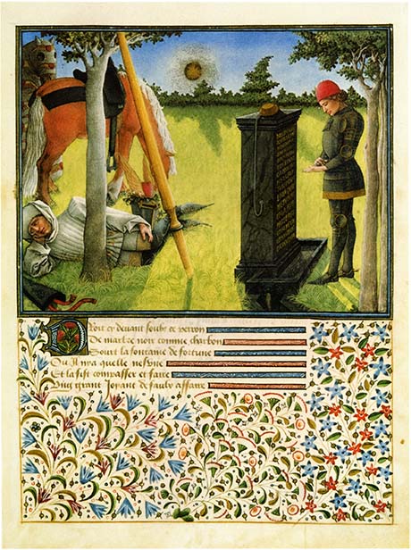 やまならし(tramble)の下で震えながら(trambler)夜を過ごした。「心」は旅の予言と思える怪しい夢を見て翌朝早く目覚めた。曙の光の中で、泉の碑文を読んでその泉が「運命の泉」であることを知った。樹下で「欲望」は眠り続け、その足下には「心」が脱いだ兜が置かれている。