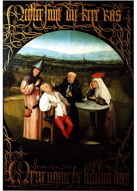 患者の言葉が能書家によるゴシック体の装飾文字で画面上部と下部に記されている。「先生、石(keye)を取り出してください。私の名前はルッベルト・ダスです」。外科医は欺瞞の象徴の「逆さ漏斗」をかぶっているので偽医者、取り出しているのは睡蓮のような花でテーブルにも置かれている。患者に苦痛の表情がないことから、寓意的であることがわかる。女助手もその頭にトリックの指南書を乗せているとされる。