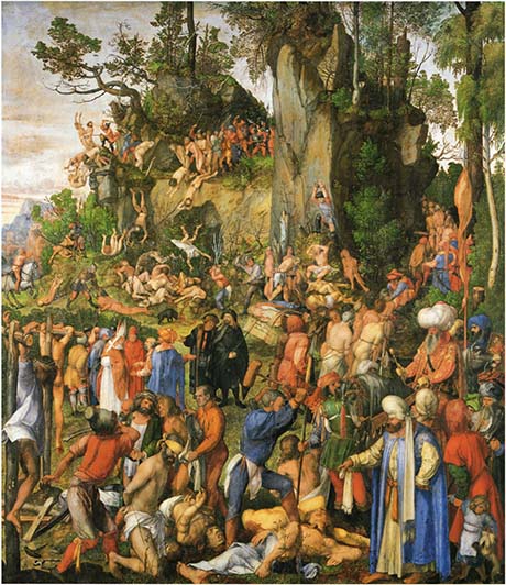 主題はディオクレティアヌス帝の命で、303年にペルシア王シャープールが小アジアのビティニア地方でおこなった迫害。デューラーは、10年ほど前に木版画でこの主題を扱っていた。アルベルティーナ素描版画館にペンによる構想図が残されている。