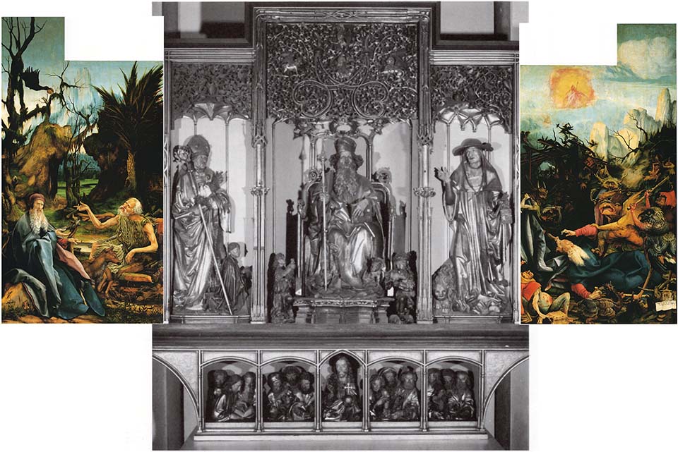 聖アントニウスの大祭に開かれる第3場面。左翼「聖アントニウスの聖パウルス訪問」、右翼「聖アントニウスの誘惑」、中央に1505年ハーゲナウアー作の木彫群(モノクロ)。木彫群の中央はアントニウス、左にアウグスティヌス、右にヒエロニムス。アントニウスは家畜の守護聖人でもあったため、農民が鶏や子豚を差し出している。アウグスティヌスの前で跪いているのはグエルシの前任者オルリアコ。プレデッラが開きキリストと十二使徒の木彫群も現れる。
